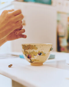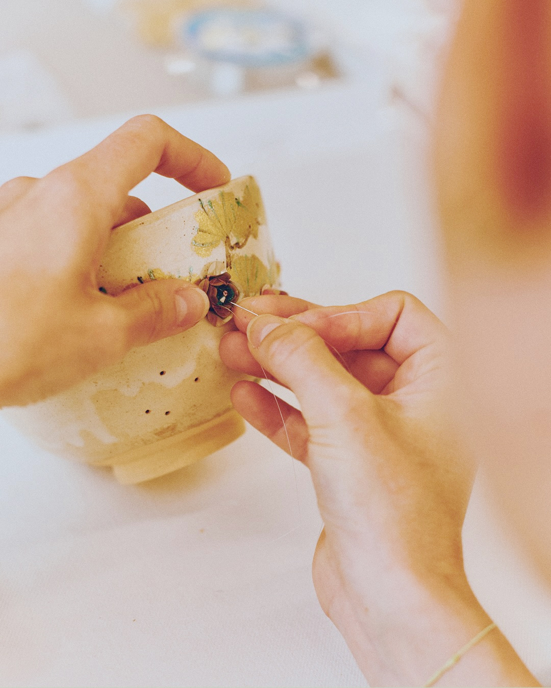 伝統的な茶碗に穴を空け、刺繍します。